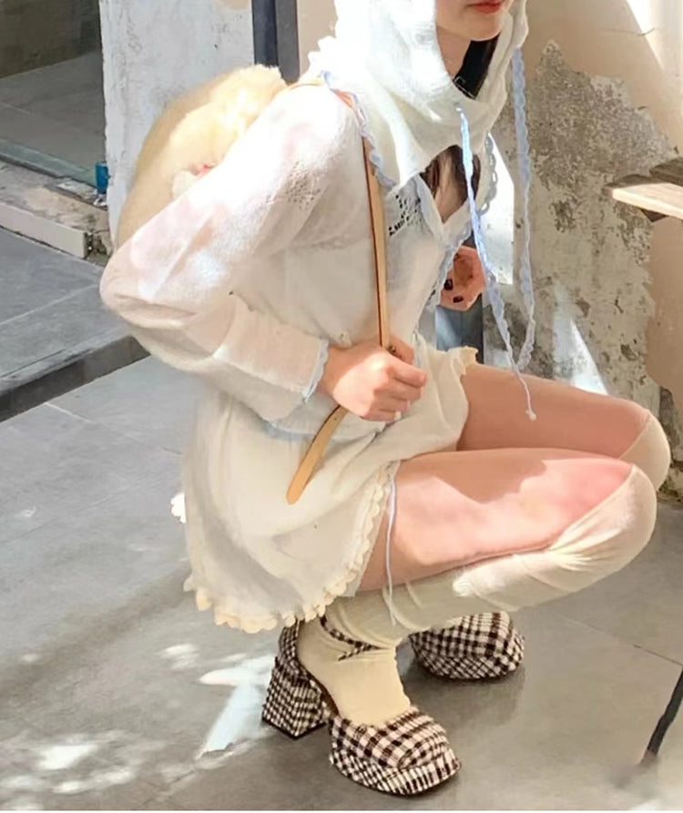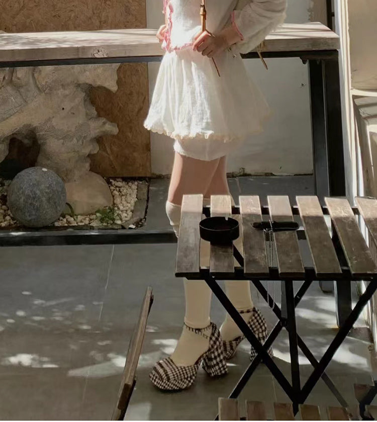 Printed black and white plaid block heel high heel Mary Jane